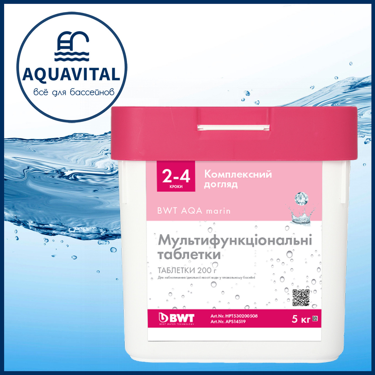 BWT AQA marin Multifunktional — це сучасний потужний засіб для обробки води у басейні, розроблене провідними австрійськими фахівцями в області дезінфекції води. Застосовується в якості підтримки гігієни води. У складі таблетки 4 компоненти: